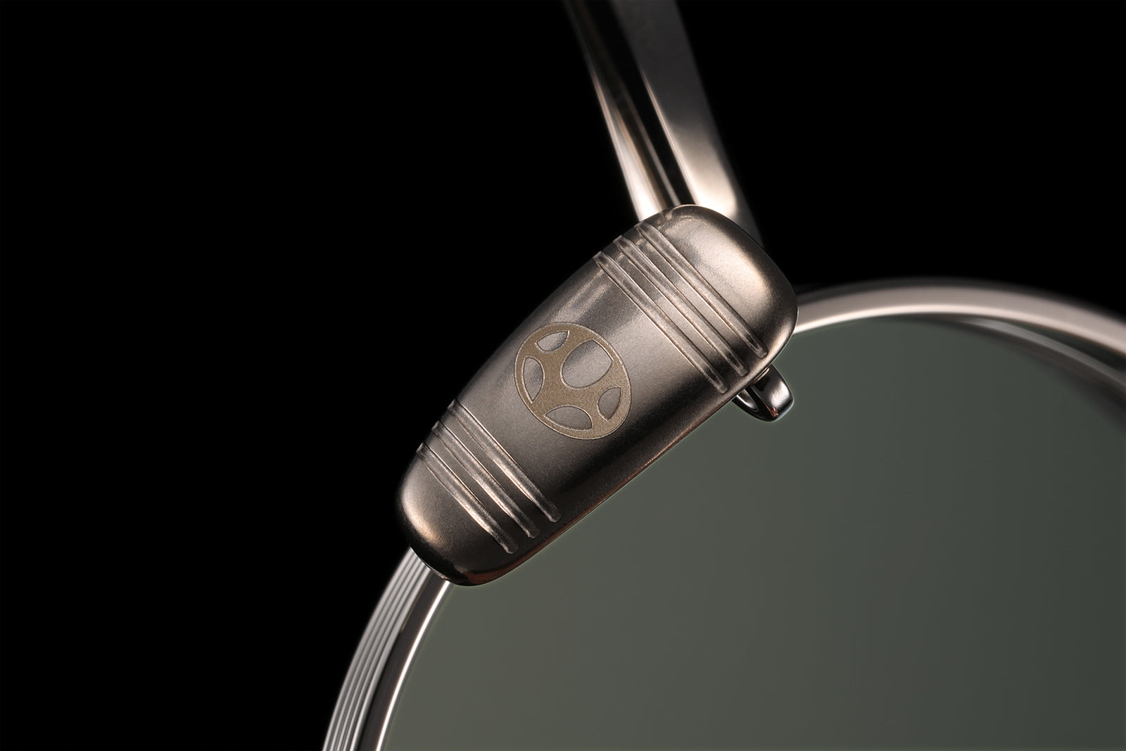 定番かつ個性的なクラシカルスタイルを味わえるラウンドモデル。上方に跳ね上がるフリップアップ機構で、無骨ながらも洗練されたフォルムを誇る。レコード溝のようなデザインで厚みを持たせたレコードリムや、モダン部までカナテ仕様となった細部への拘りが、装着時のアップグレードを叶えてくれる。チタンパッドにはDIGNA Classicのブランドアイコン”カブト”がレーザー彫りされ、より美しさが際立つ逸品に仕上がっている。