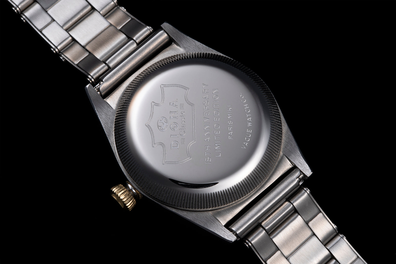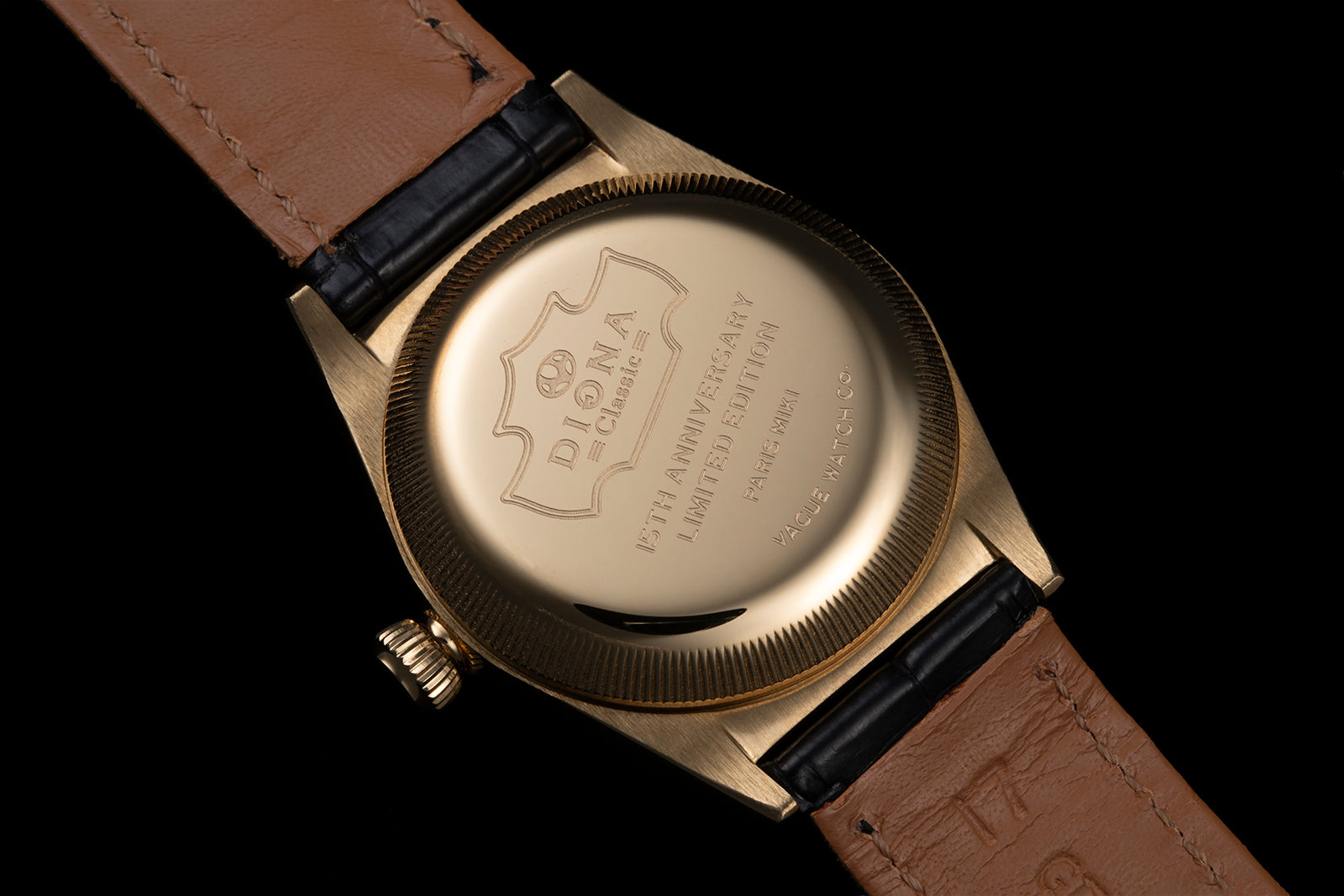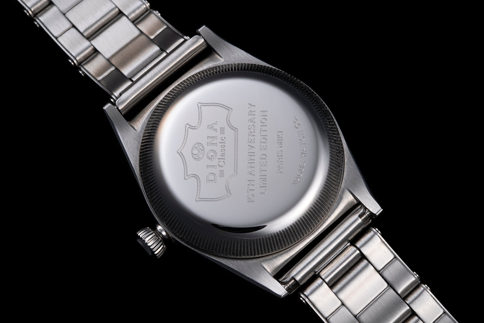 DIGNA Classic15周年を記念したVAGUE WATCHコラボレーションのアニバーサリーウォッチ。バブルバックの愛称で知られる、気泡のように膨らんだスクリュー式ケースバック(裏蓋)と、硬質クリスタルガラスを使用したドーム型風防は、腕時計が進化する中で生まれた極めて機能的なディテール。DIGNA Classicの世界観を体現できる記念時計をリミテッド・リリース。