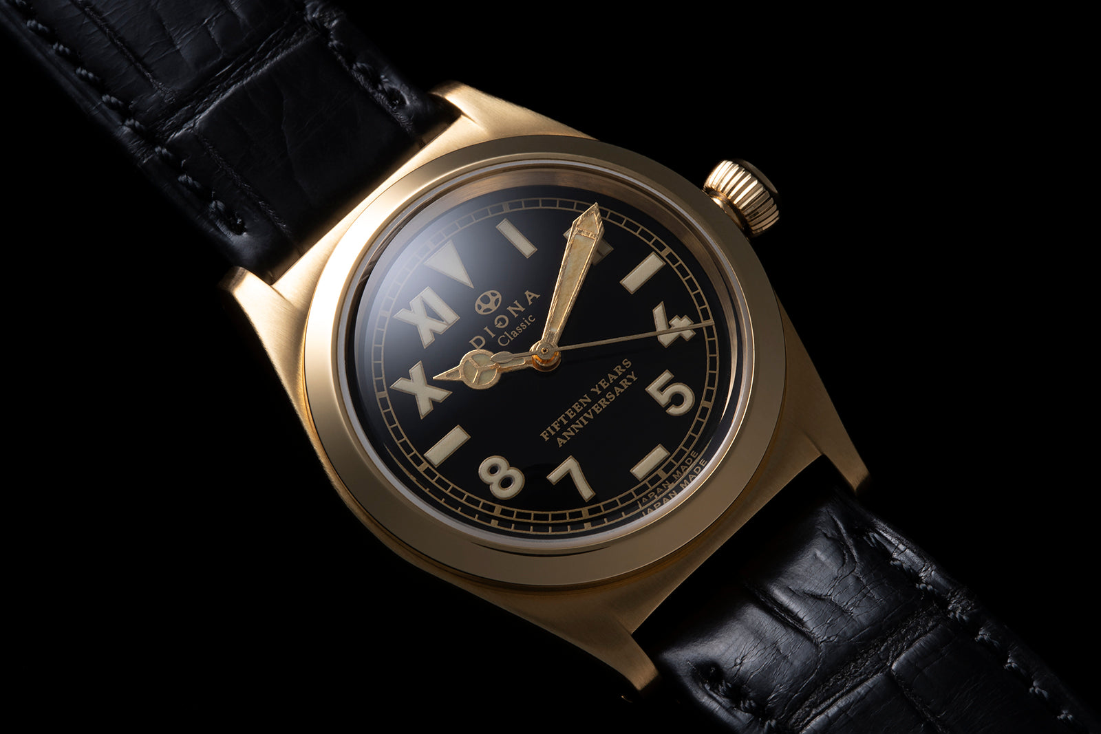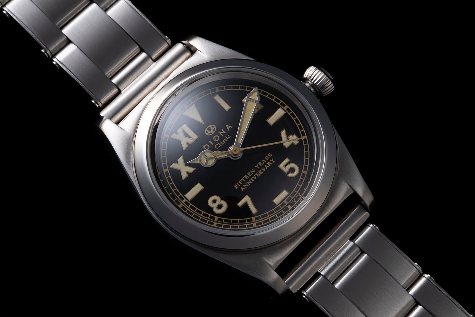 An anniversary watch was made in collaboration with VAGUE WATCH Co. to commemorate DIGNA Classic’s 15th anniversary. It features two extremely functional details that emerged in the evolution of the wristwatch: a rounded, protruding screw-down case back known as the “bubble back,” and a domed watch crystal made of durable crystal glass. A limited-edition commemorative watch that embodies the DIGNA Classic worldview.