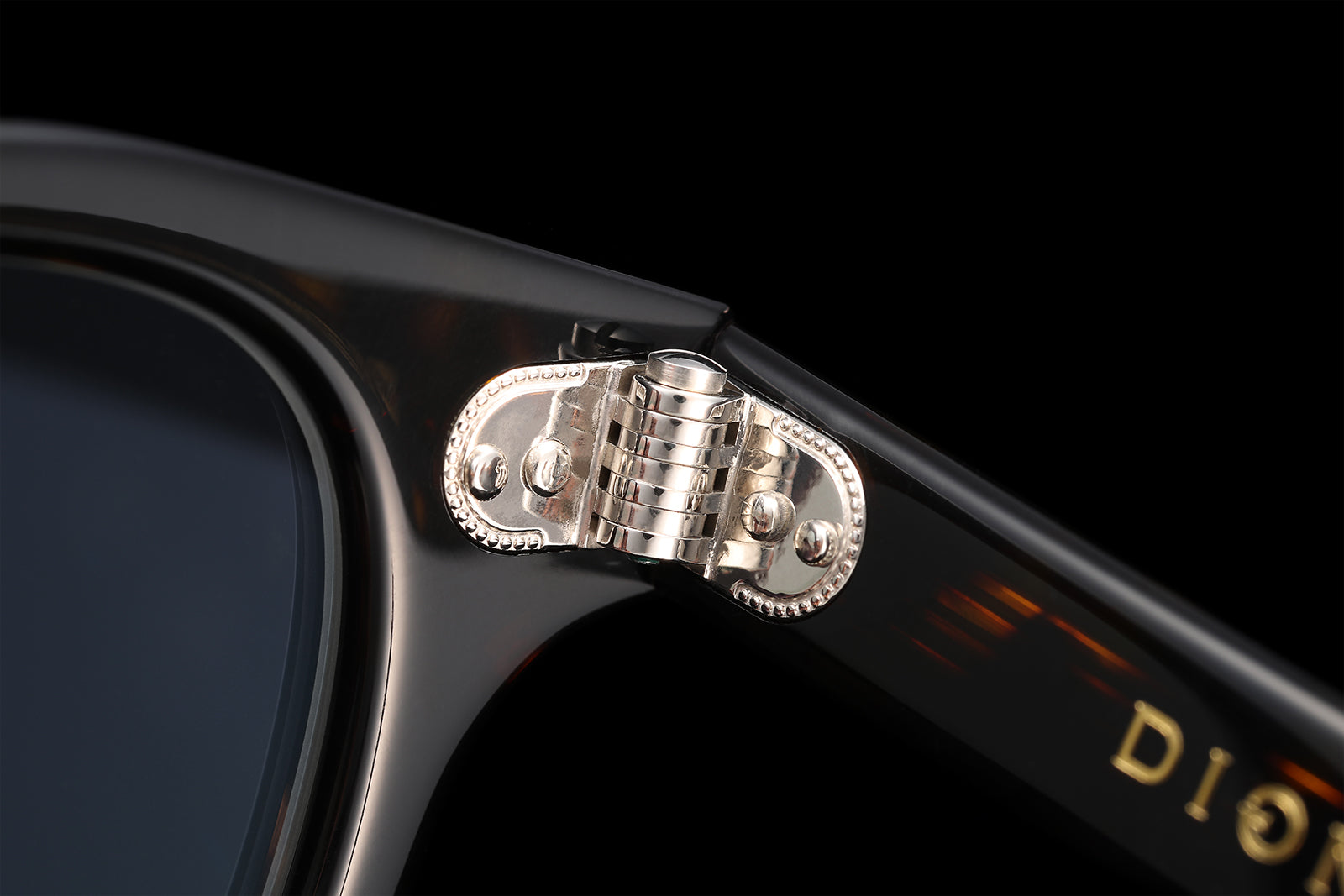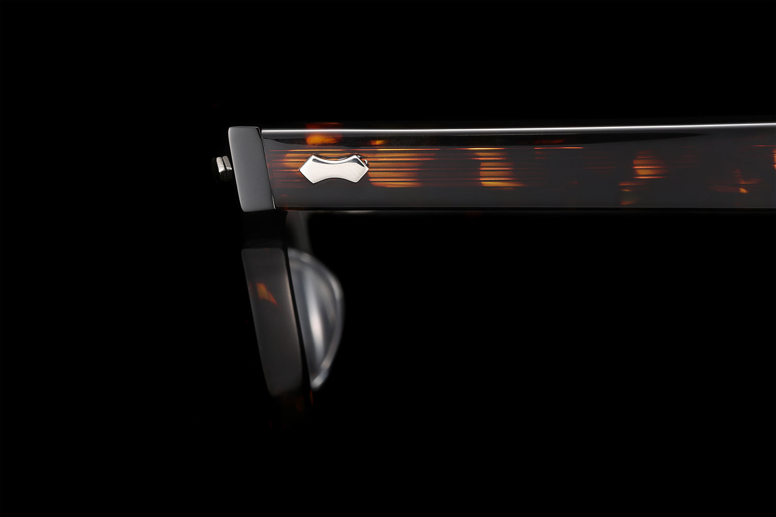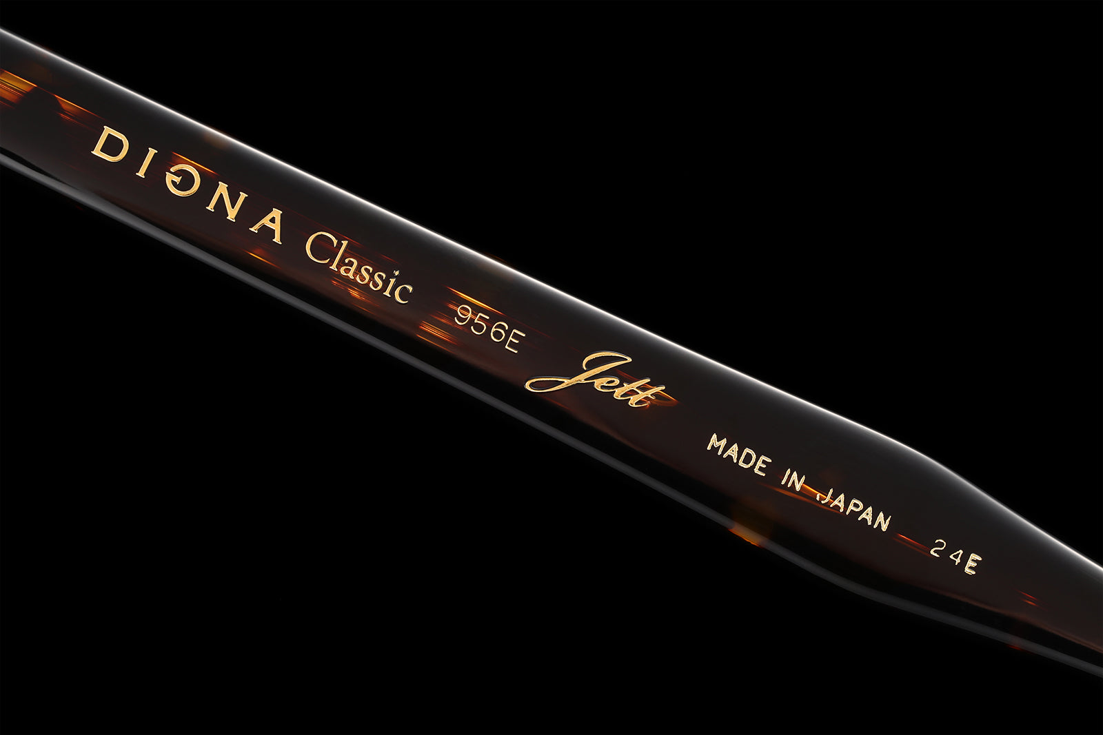 DIGNA Classicのマスターピースである”ジミー”のパントシェイプ“ジェット”がリニューアル。サンプラチナ製のダブルダイヤリベット、テンプルエンドのギザは健在であり、独自開発された10度傾斜のフロント用丁番には、台座に繊細なミル打ちされたドット柄が施されている。日本製の精度の高さが見て取れるエボリューションモデル。