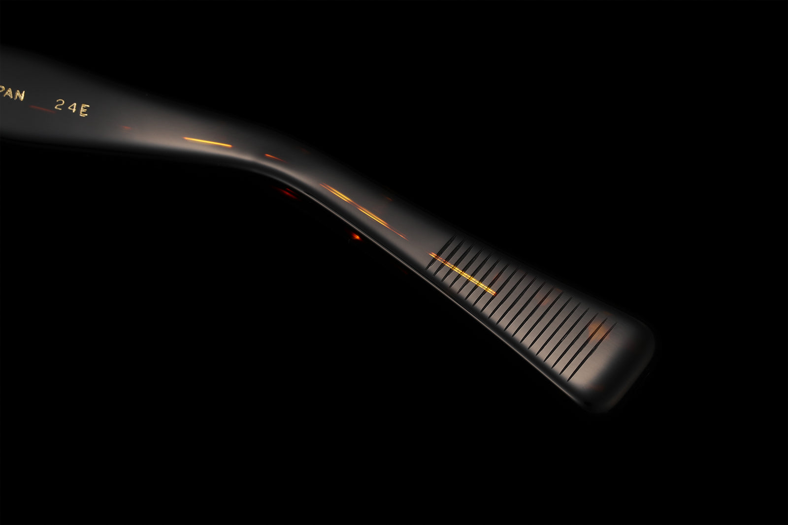 This is a renewed model of Jett, a Panto shape version of DIGNA Classic’s masterpiece Jimmy. It retains the double diamond rivets made of Sun Platinum Metal and the serrated temple ends. The front hinge with a 10-degree tilt, developed by the brand, is adorned with a finely milled dot pattern on the base. This evolution model showcases the high level of precision of Japanese craftsmanship.