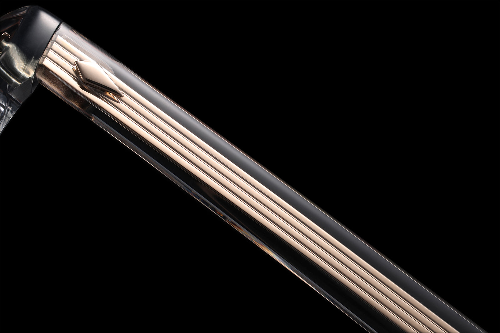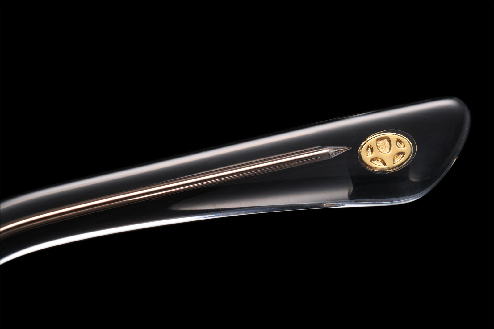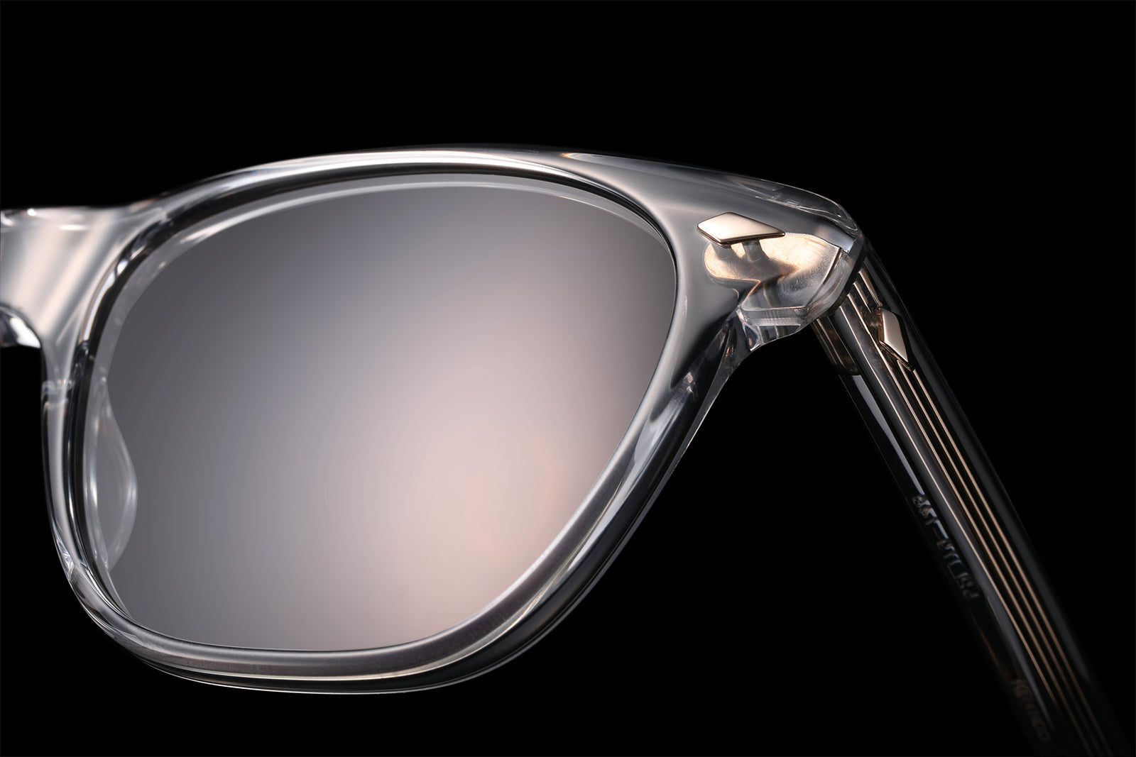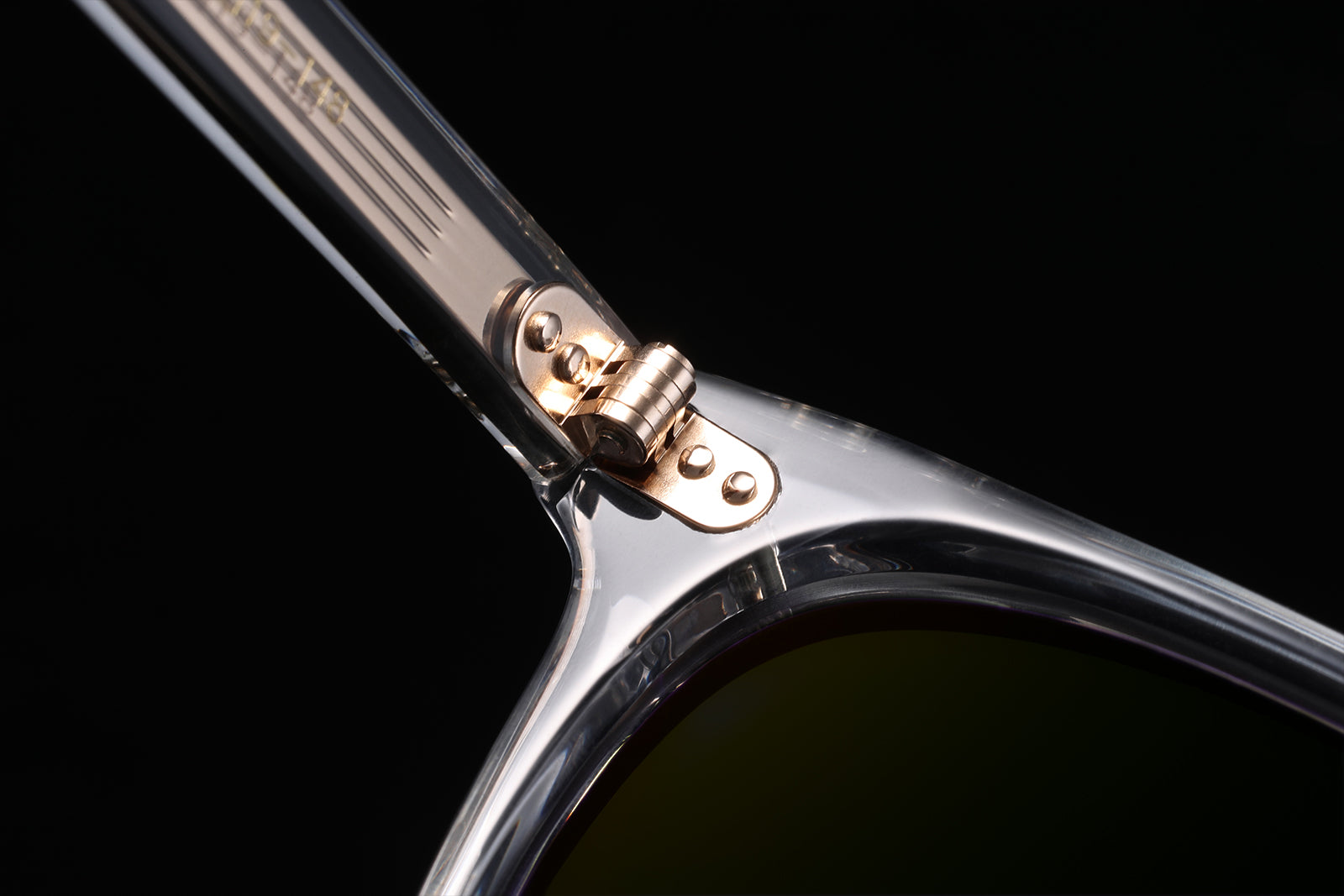 Modelled on the typical Wellington lens shape that was the U.S. standard in the 1950s, JACK is reborn today as a tribute model, reinterpreted in the DIGNA classic style. It has an unparalleled, stunning textured finish, thanks to the handmade techniques of skilled craftspeople in Sabae City. The rivets on the front and temples with authentic hinges are custom made of corrosion-resistant Sun Platinum Metal. High-grade acetate is hand-polished by craftspeople to give it a unique luster, a sign of high quality. The brand’s iconic kabuto samurai helmet is inlaid in the left temple tip.
