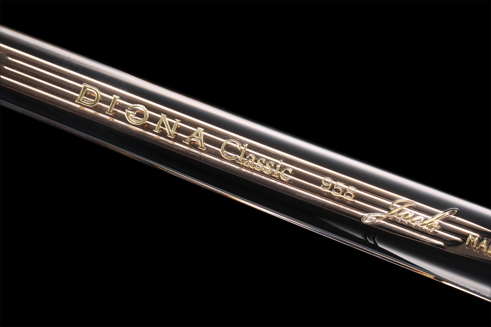 1950年代、アメリカンスタンダードとも言える典型的なウェリントンのレンズシェイプを持つモデルをベースに、DIGNA classic的解釈の元、今の世にオマージュモデルとして再度誕生した”JACK”。鯖江の熟練工によるハンドメイドにより、比類なき圧倒的な質感で仕上がっている。本格的なカシメ留めを行なったフロント、テンプルのリベットは、腐食しにくいサンプラチナ製で別注した。高品質なアセテートは、職人の手磨きにより独特なツヤ感で高品質であることを物語り、左バチ先のブランドアイコン”カブト”もインレットにて投入されている。