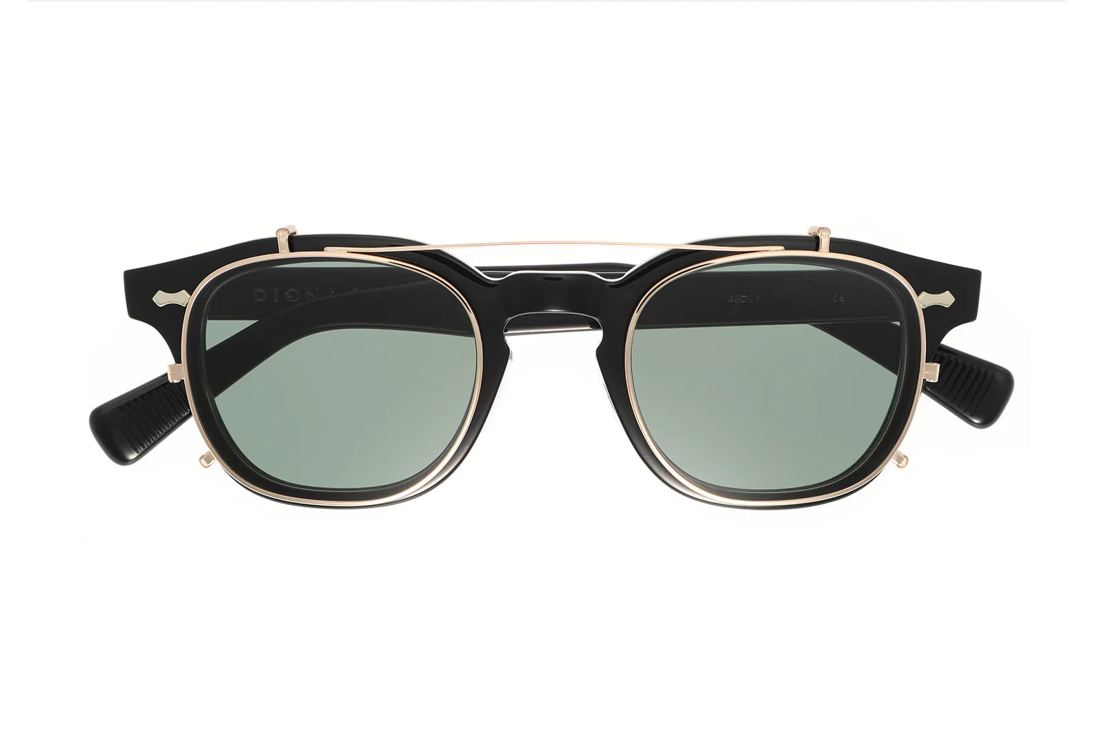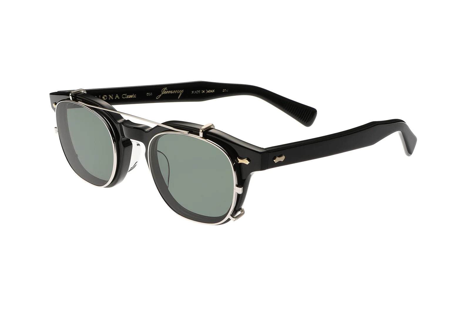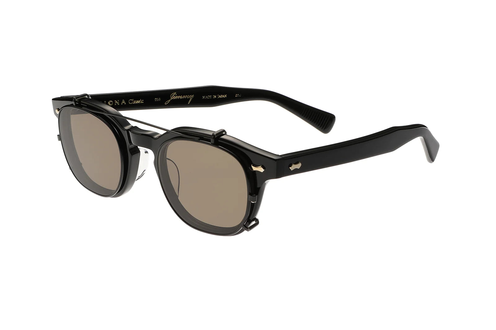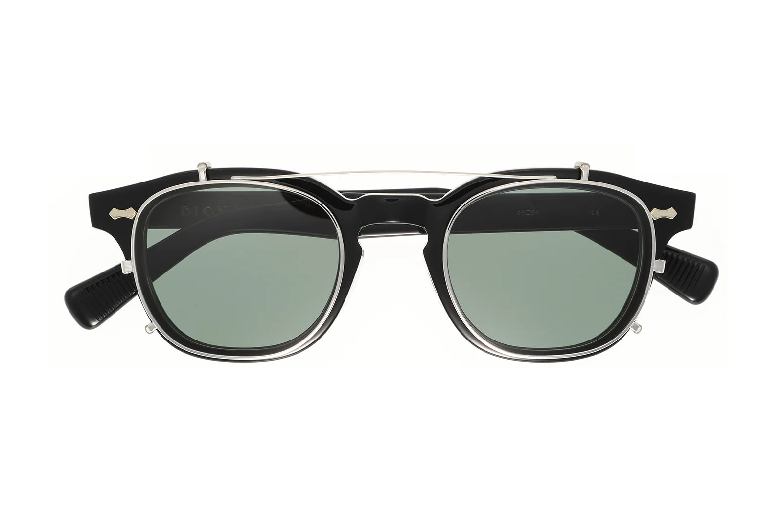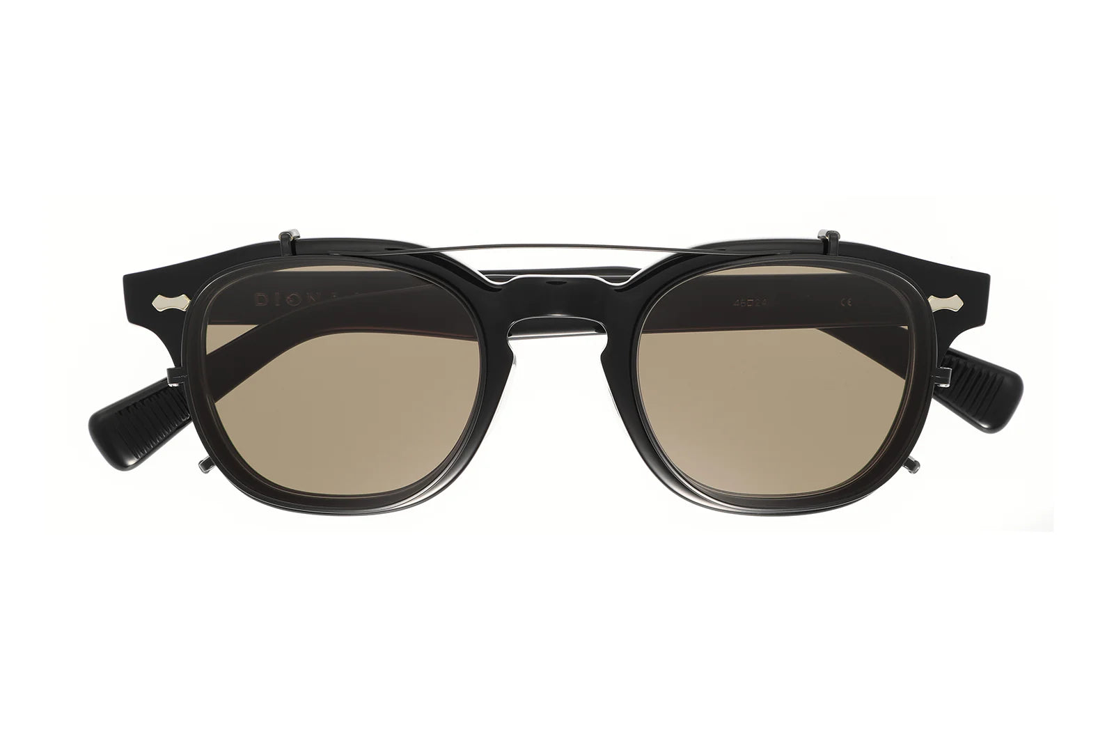 Clip-on shades exclusively for DIGNA classic “Jimmy.” Now attachable and removable with clips on four locations, this model made of titanium and beta titanium is lightweight and durable.The lens has a 2-base curve and an anti-reflective coating on the back of the lens, offering flawless functionality.
